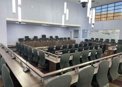 The brief called for the provision of a council chamber to accommodate 88 councilors and a public seating area for 82 members of the public. The building was to further accommodate offices for municipal officials and politicians, four boardrooms, seating between twenty to thirty people each, a canteen/ restaurant, seating 100 persons, with related catering facilities and parking.