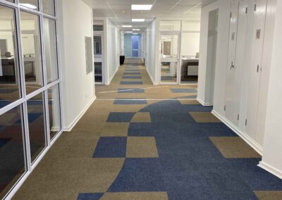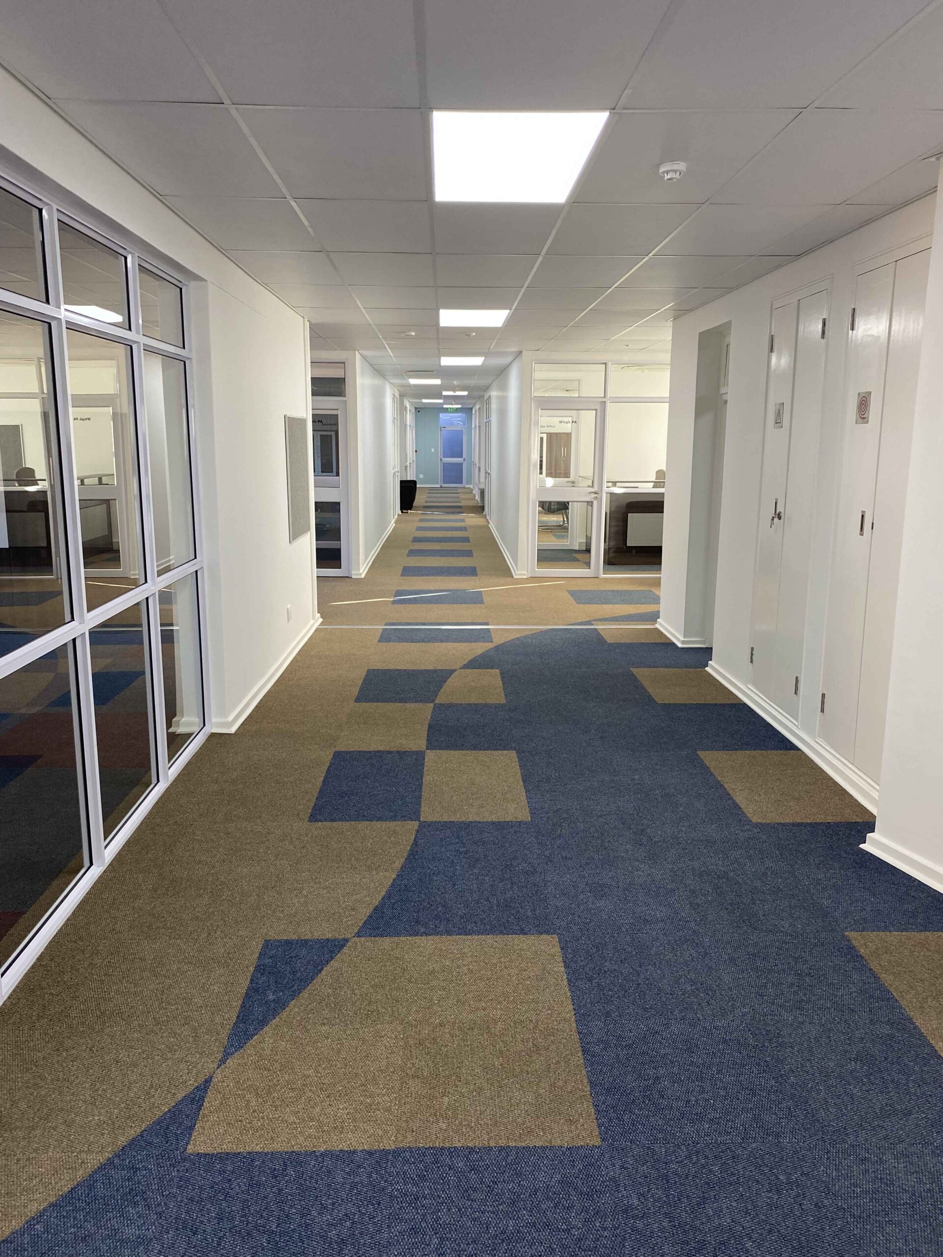 The north facing fenestration on the first floor is shielded from direct light by the use of louvres while the lower level offices are protected from direct light by the overhang of the first floor over the ground floor, thus negating the need for louvres.